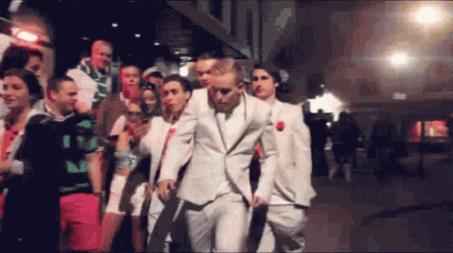 Paglalarawan ng Content: a man in a white suit and red tie is walking through a crowd of people