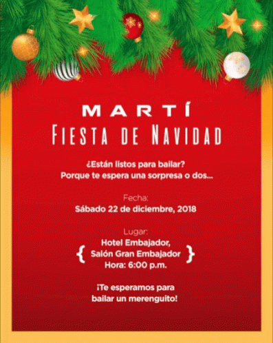 Paglalarawan ng Content: a red and yellow poster for marti fiesta de navidad with christmas decorations on it