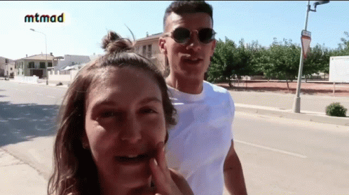 Paglalarawan ng Content: a man and a woman are standing next to each other on a street with a sign that says mtmad on it