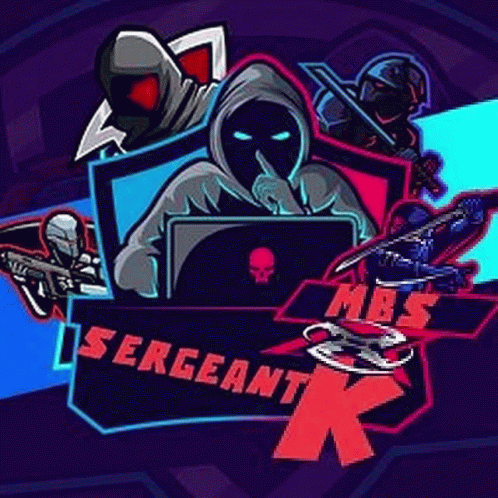 Paglalarawan ng Content: a logo for a video game called sergeant k with a hooded man using a laptop computer .