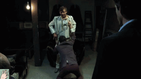 Paglalarawan ng Content: a man in a suit is touching another man 's leg in a room with folding chairs