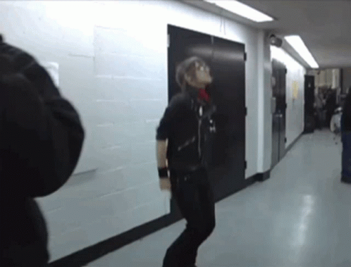 Paglalarawan ng Content: a man in a black jacket is dancing in a hallway next to a door