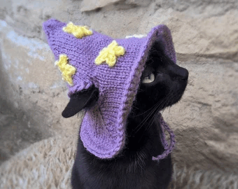Paglalarawan ng Content: a black cat wearing a purple witch hat with yellow stars on it