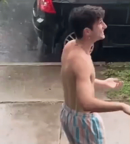 Paglalarawan ng Content: a shirtless man in swim trunks is walking down a sidewalk .