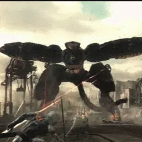 Paglalarawan ng Content: a video game scene with a giant robot flying over a city