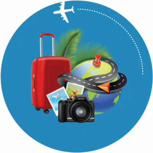 Paglalarawan ng Content: an illustration of a suitcase a camera a globe and an airplane on a blue background