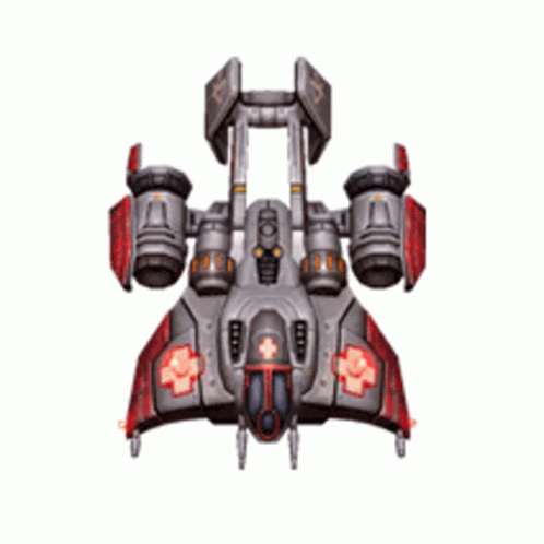 Paglalarawan ng Content: a gray and red space ship with a red cross on it