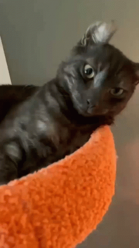 Paglalarawan ng Content: a black cat with a white ear is laying on an orange cat bed .