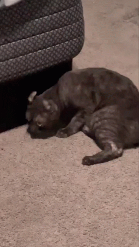 Paglalarawan ng Content: a cat is laying on a carpet next to a mattress .