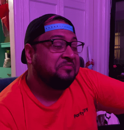 Paglalarawan ng Content: a man wearing glasses and a red shirt that says partyally