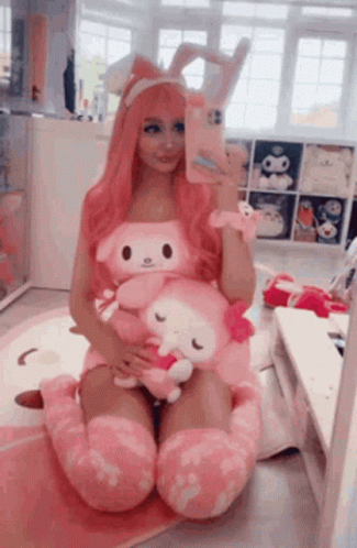 Paglalarawan ng Content: a woman with pink hair is kneeling down holding a stuffed animal and taking a selfie .