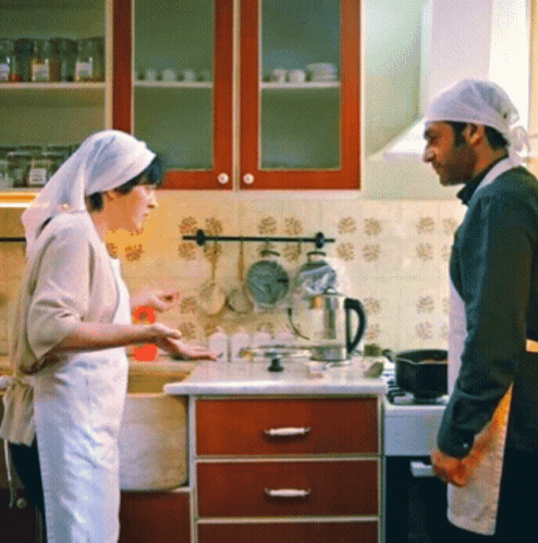 Paglalarawan ng Content: a man and a woman are standing in a kitchen and the woman is wearing a white head scarf