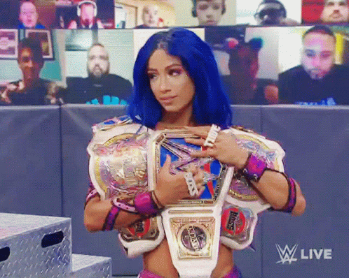 Paglalarawan ng Content: a woman with blue hair is holding a world heavyweight championship belt ..