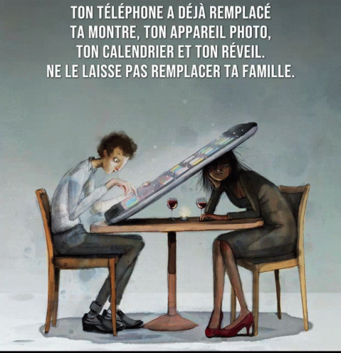Paglalarawan ng Content: a drawing of a man and woman sitting at a table with a cell phone on the table
