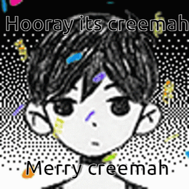 Paglalarawan ng Content: a black and white drawing of a boy with the words `` hooray its creemah merry creemah ''