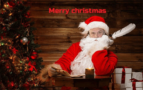 Paglalarawan ng Content: a picture of santa claus with a feather in his mouth and the words merry christmas