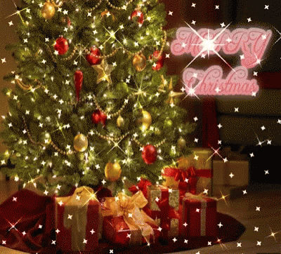 Paglalarawan ng Content: a christmas tree with gifts underneath it and a merry christmas sign above it