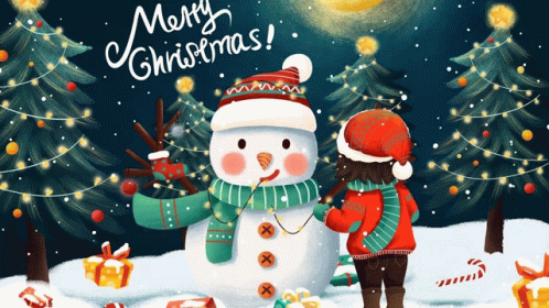 Paglalarawan ng Content: a child is standing next to a snowman with merry christmas written above it
