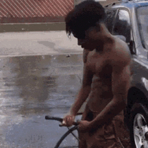 Paglalarawan ng Content: a man without a shirt is washing a car with a hose
