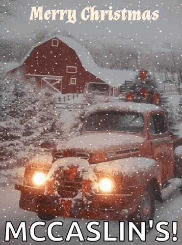 Paglalarawan ng Content: a red truck with a christmas tree on top of it and the words merry christmas mccaslin 's below it