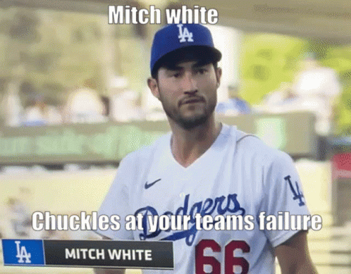 - Paglalarawan ng Content: a baseball player wearing a dodgers jersey and a sign that says mitch white chuckles at your teams failure