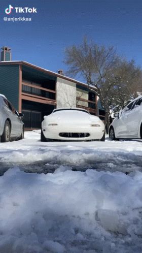 Paglalarawan ng Content: a white car is parked in a snowy parking lot with a building in the background