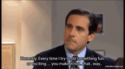 Paglalarawan ng Content: a man says " honestly every time i try to do something fun or exciting you make it not that way "