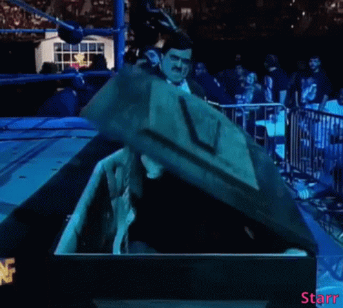 Paglalarawan ng Content: a man in a mask is sitting in a coffin with the word starr on the bottom