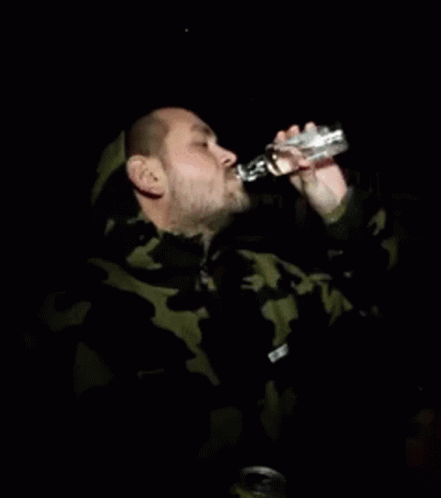 Paglalarawan ng Content: a man in a camo jacket is drinking from a bottle in the dark .