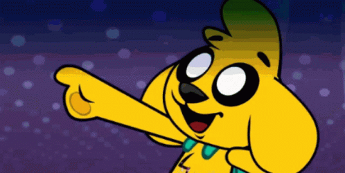 Paglalarawan ng Content: a yellow cartoon dog is pointing to the right