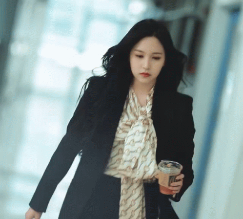 Paglalarawan ng Content: a woman in a suit and scarf is holding a starbucks cup