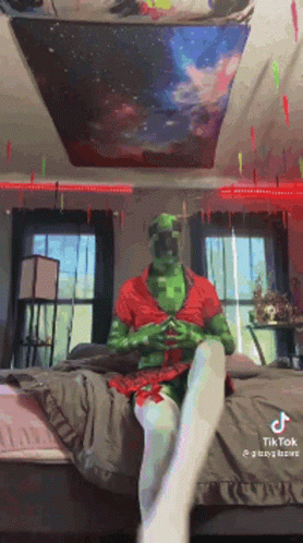 Paglalarawan ng Content: a person dressed as a green monster is sitting on a bed .