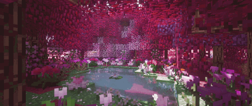 Paglalarawan ng Content: there is a pond in the middle of a lush green forest surrounded by pink flowers .
