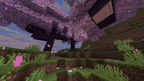 Paglalarawan ng Content: a video game scene with a cherry blossom tree and a sign that says ' minecraft ' on it