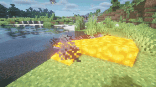 Paglalarawan ng Content: a minecraft scene with a yellow block in the foreground and a river in the background