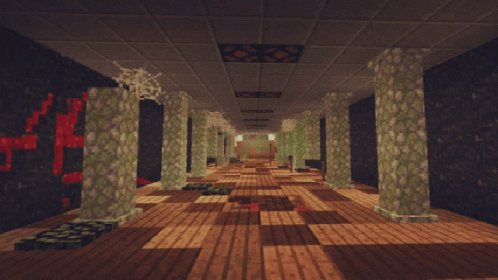 Paglalarawan ng Content: a hallway in a minecraft game with columns and a spider on the ceiling