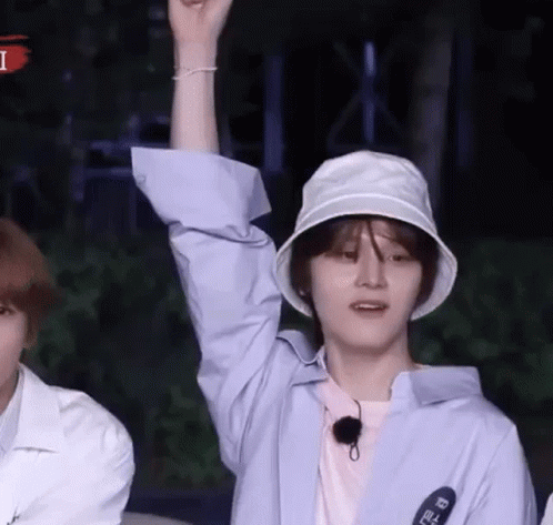 Paglalarawan ng Content: a young man wearing a bucket hat is holding his hand up in the air .