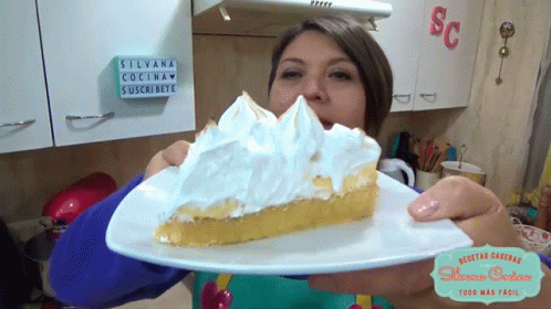 Paglalarawan ng Content: a woman is holding a slice of pie in front of a sign that says " silvana cocina suscribete "