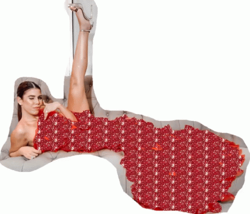Paglalarawan ng Content: a woman in a red dress is laying on a couch with her legs up