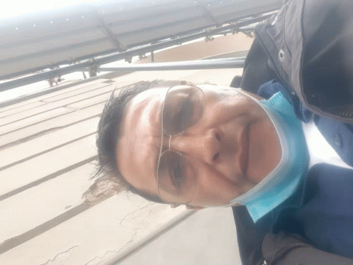 Paglalarawan ng Content: a man wearing a mask and glasses looks down