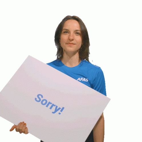 Paglalarawan ng Content: a woman wearing a blue afas shirt holds a sign that says sorry