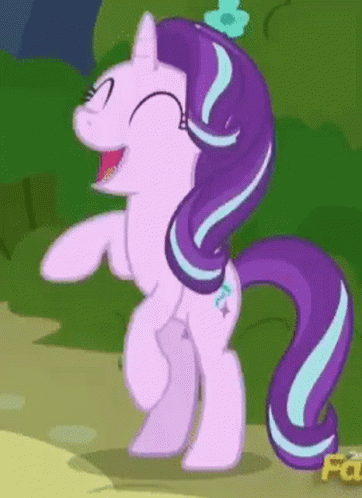 Paglalarawan ng Content: a cartoon pony with a purple mane and tail is standing on one leg and smiling .