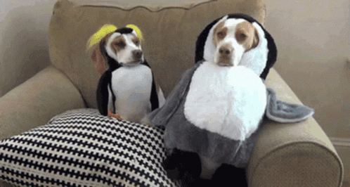 Paglalarawan ng Content: two dogs are dressed in penguin costumes and sitting on a couch .