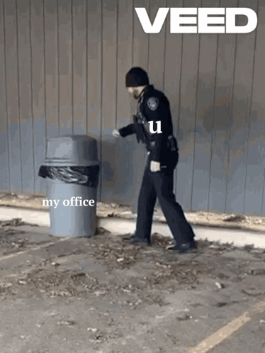 Paglalarawan ng Content: a police officer is walking towards a trash can that says " my office "
