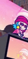 Paglalarawan ng Content: a cartoon character wearing sunglasses and a pink hat is sitting in front of a computer monitor .