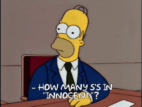 Paglalarawan ng Content: a cartoon of homer simpson asking how many 's in ' innocent '