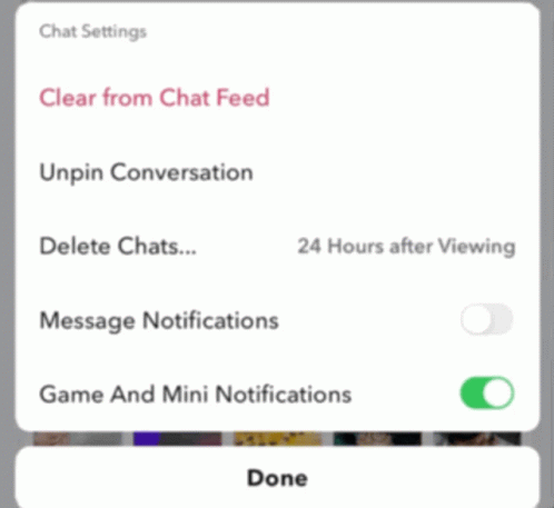 - Paglalarawan ng Content: a screenshot of a chat settings screen shows the options to clear from chat feed unpin conversation delete chats and message notifications