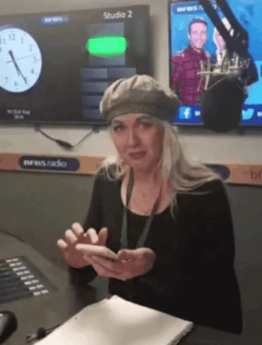 Paglalarawan ng Content: a woman sitting at a desk with a phone in front of a screen that says studio 2