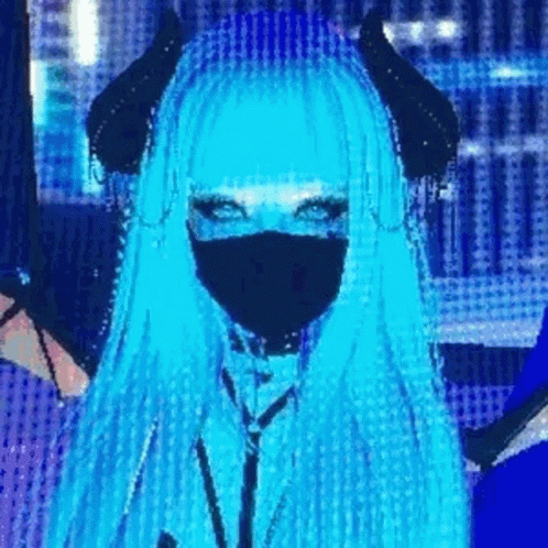 Paglalarawan ng Content: a girl with blue hair and horns is wearing a mask and a choker .