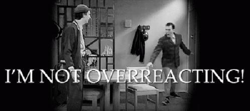 - Paglalarawan ng Content: a black and white photo of two men standing next to each other with the words `` i 'm not overreacting '' .